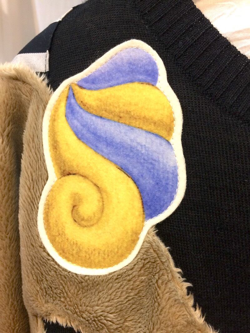 向かい合う射手座をファーニット切り替えとプリントで表現、たてがみはオーガンジーリボンを縫い込んでいます。
